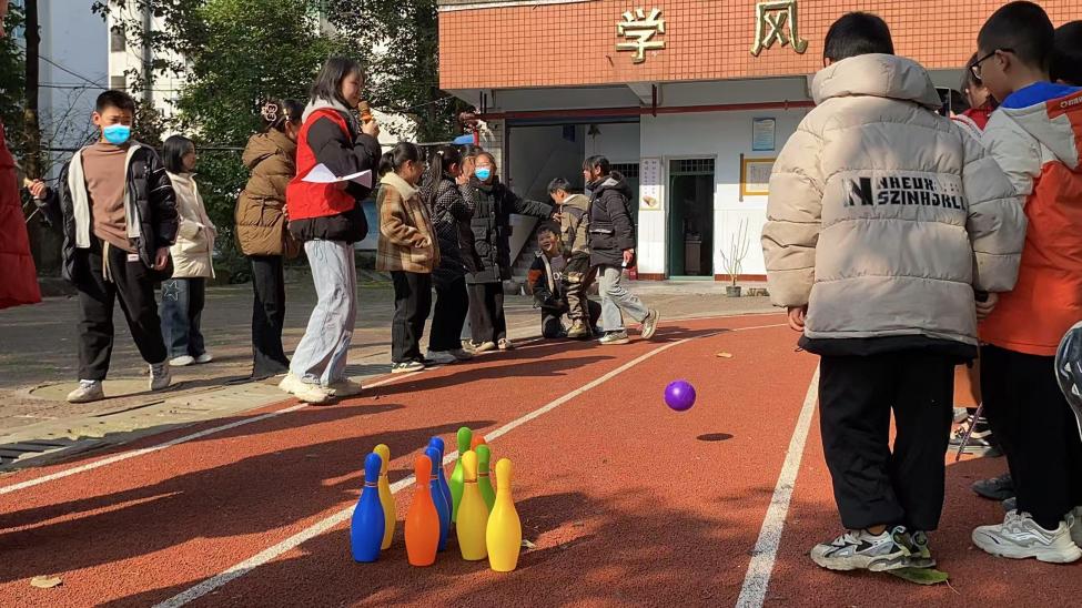 活动当日,校园内充满了欢声笑语。主题活动首先由一场趣味游戏开始,游戏设置了打保龄球、吹乒乓球以及“你比划我猜”等多个趣味项目。保龄球区域,孩子们排着整齐的队伍,一个个摩拳擦掌,尝试用手中的球击倒保龄球瓶,每一次成功的击球都引发周围小伙伴们的欢呼与喝彩。吹乒乓球游戏同样热闹非凡,孩子们鼓起腮帮子,努力吹动漂浮在水面上的乒乓球,小小的脸蛋因用力而涨得通红,现场气氛热烈。你比划我猜游戏中,孩子们充分发挥想象力与表现力,比划的同学手舞足蹈,猜题的同学绞尽脑汁,猜错时大家哄堂大笑,猜对后又一起兴奋地尖叫,在游戏过程中,孩子们不仅收获了快乐,还锻炼了团队协作与沟通能力。
