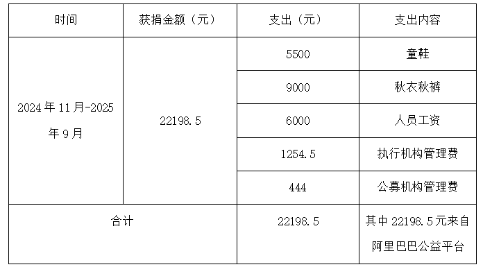 (1)童鞋和秋衣秋裤,14500元(其中14500元来自阿里巴巴公益平台)