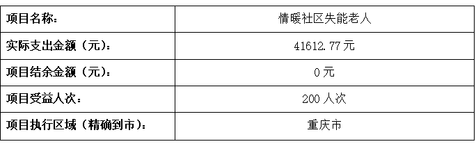 2024年11月情暖社区失能老人项目于阿里巴巴公益平台上线,实际通过阿里巴巴公益平台筹得善款41612.77元。项目自2024年11月由重庆市长寿区德邻社会工作服务中心开始执行,2025年9月执行完毕。截止2025年9月,项目共计发放保温杯和照护手册各200份。