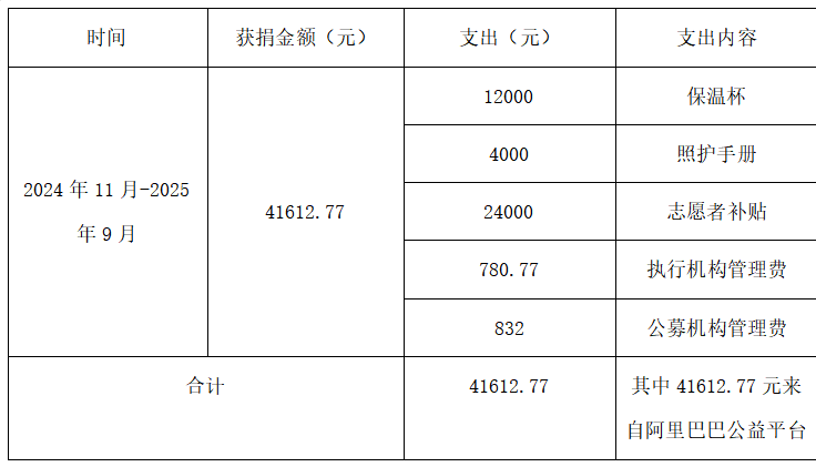 日常关怀24000元(其中24000元来自阿里巴巴公益平台)