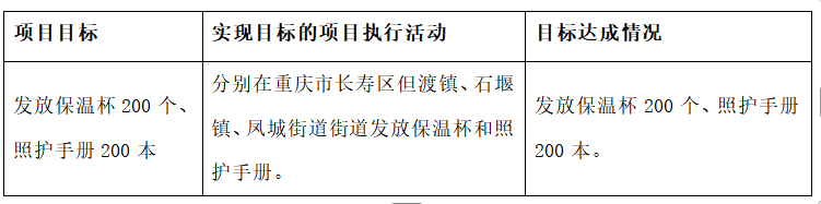 本项目计划实现发放保温杯200个、照护手册200本,为了实现目标,项目总计服务了200人次。具体执行情况请见下表。